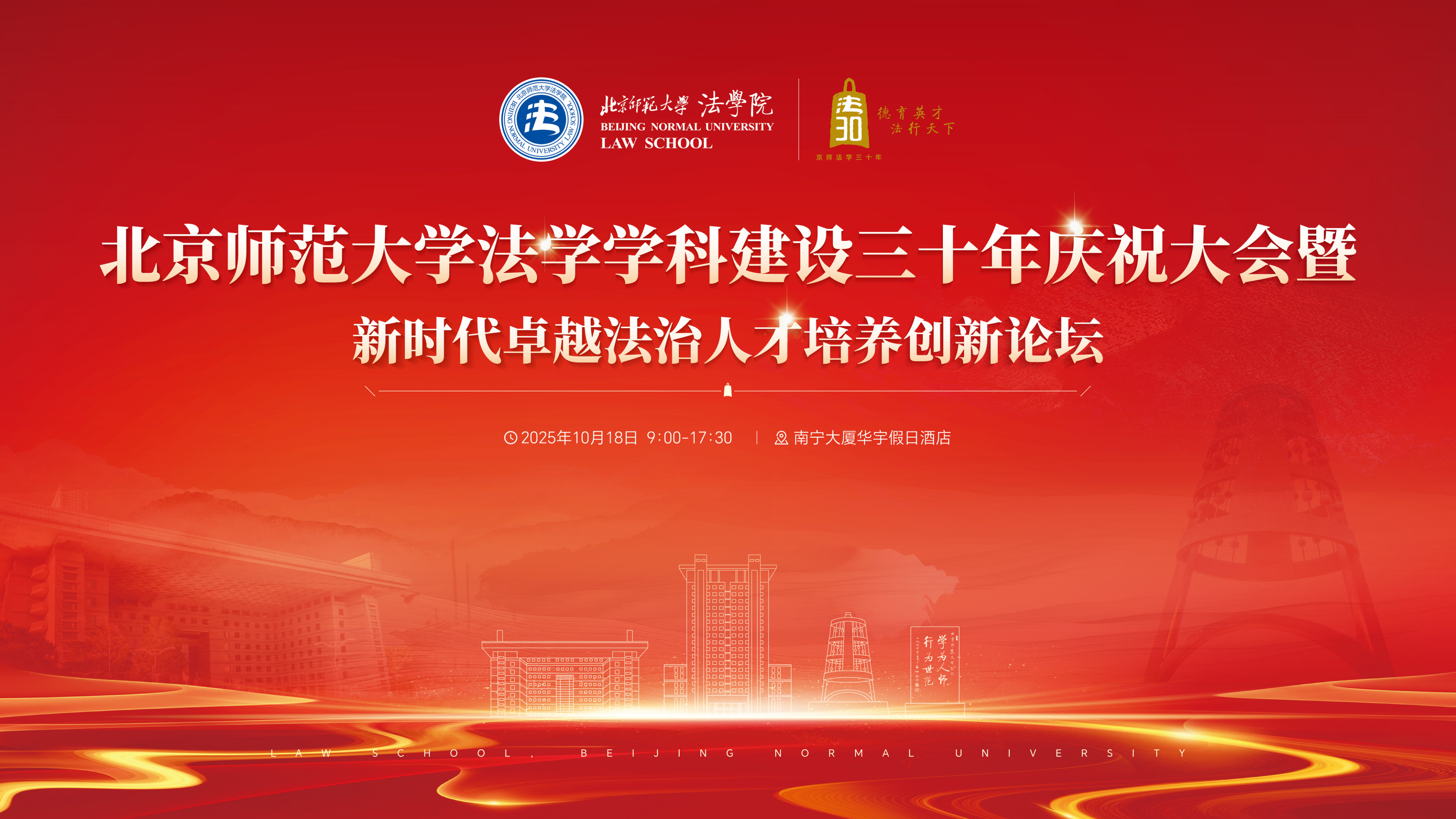 2025年10月18日,北京师范大学法学学科建设三十年庆祝大会暨新时代卓越法治人才培养创新论坛在北京隆重召开。来自全国法学界、司法实务界的知名专家学者,兄弟院校领导,广大校友与师生代表齐聚一堂,共同回顾北师大法学三十年的砥砺征程,展望新时代的使命与未来。