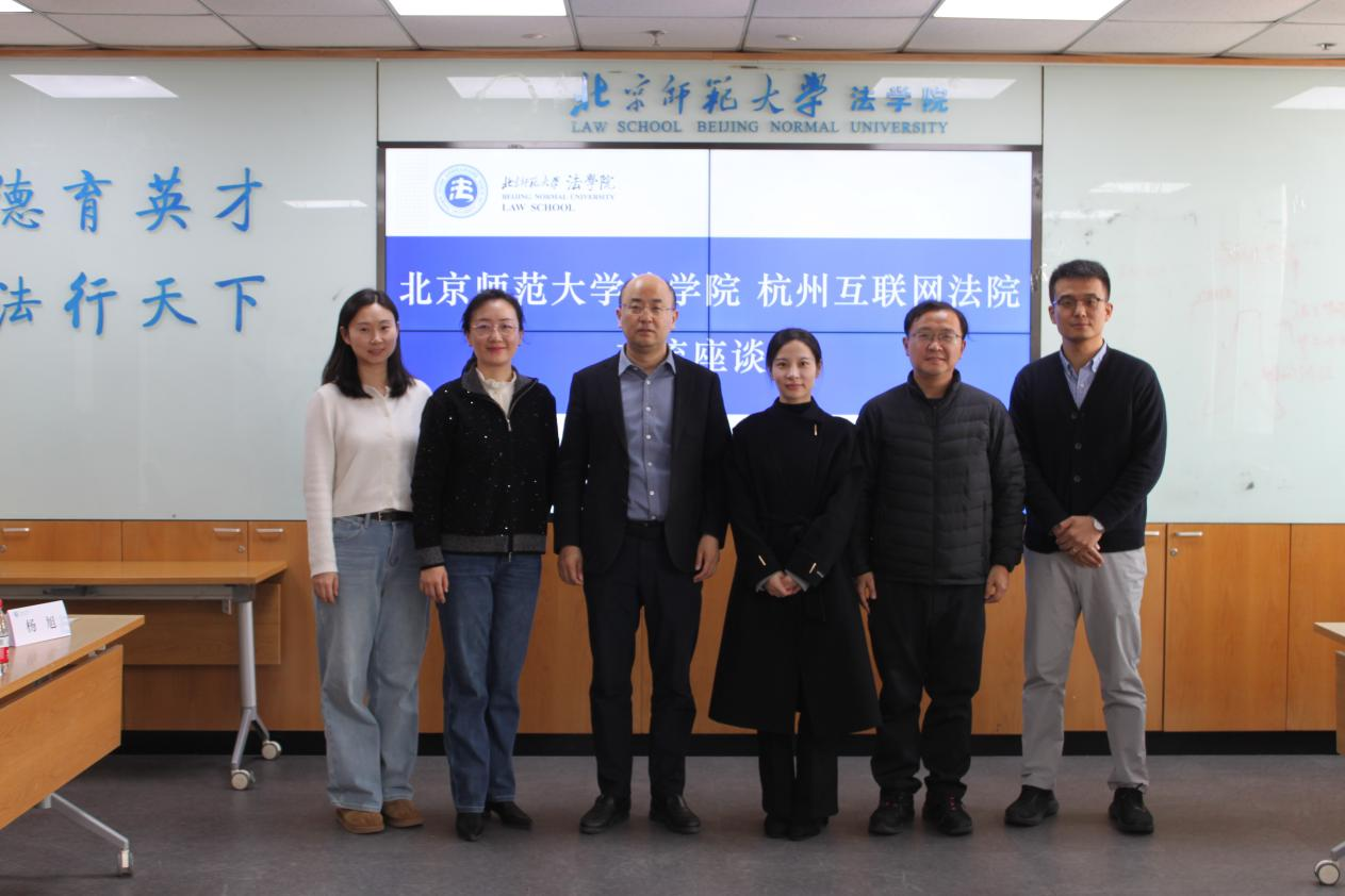 2026年3月7日,杭州互联网法院副院长王杨沁如、杭州互联网法院跨境贸易法庭庭长肖芄来访北京师范大学法学院,院长梁迎修教授、副院长郭雅婷、杨旭老师、许君竹老师接待来访嘉宾一行,双方于后主楼1922会议室举行交流座谈会。