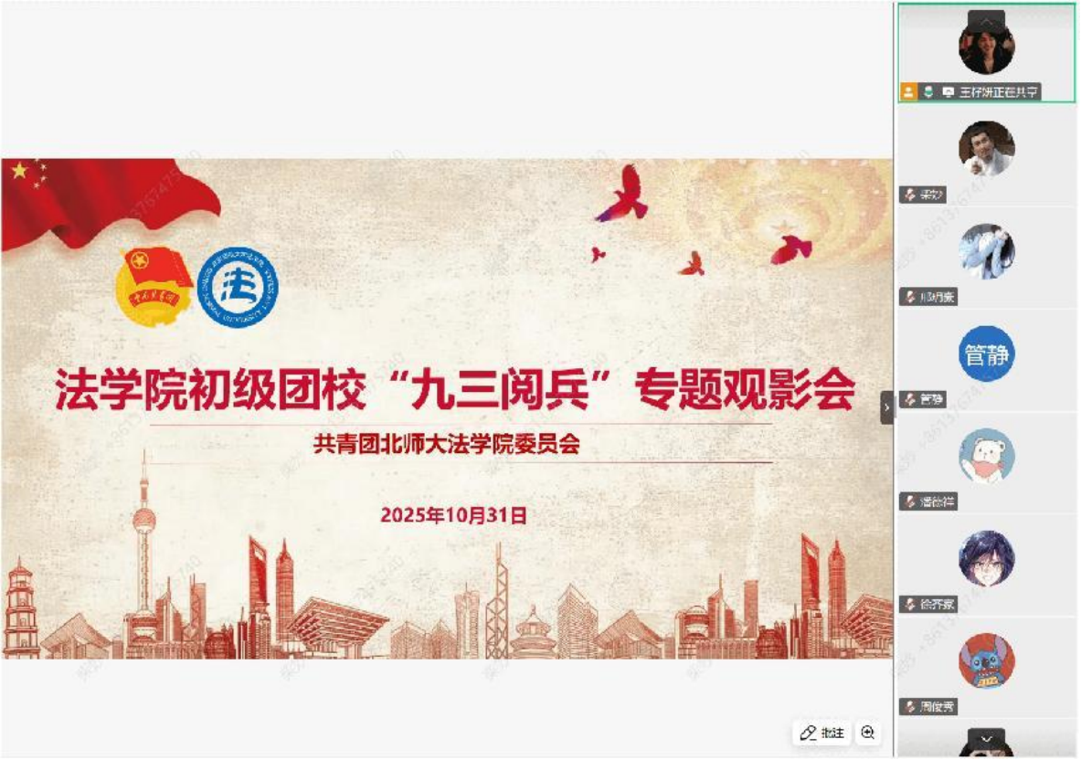 钢铁意志,再现历史印记;千万磨炼,飒沓盛世足音。为引导团校成员感悟纪律与忠诚的精神内核,学习追求卓越、团结协作的优良品质,从而坚定理想信念,将个人成长融入国家发展与民族复兴的伟大事业,10月31日,法学院团委理论研究部组织初级团校成员共同观看胜利日阅兵专题片《必胜》。在此次活动中,全体同学积极参与,深刻体悟,收获颇丰。