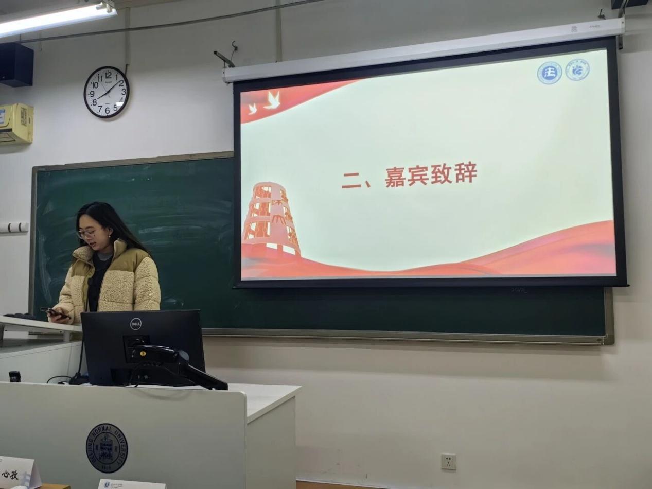 钟天茹代表北京师范大学青春讲师团出席法学院京师法“典”宣讲团启动仪式并致辞。她回顾了上一学期双方在备课研讨、课程共建等方面的紧密协作,多门优质课程成功纳入总团主课单,成果显著。她表示,总团将持续在讲师培训、课程开发、资源共享与平台建设等方面为分团提供全方位支持,并对京师法“典”宣讲团未来展现出的蓬勃活力与创新潜力寄予热切期待。