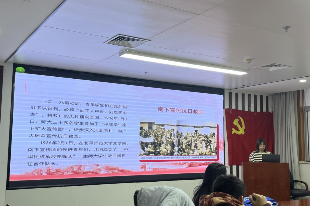 宣讲在庄重而热烈的氛围中拉开帷幕。主讲人施晨蕊同学以“何为时代先声”为引,带领同学们穿越时空,回到1935年华北危局的历史现场。“华北之大,已安放不得一张平静的书桌了!”这句响彻历史的呐喊,至今仍振聋发聩。通过珍贵的历史影像与文献资料,同学们深刻感受到当年北平学子在民族存亡之际的觉醒与抗争。