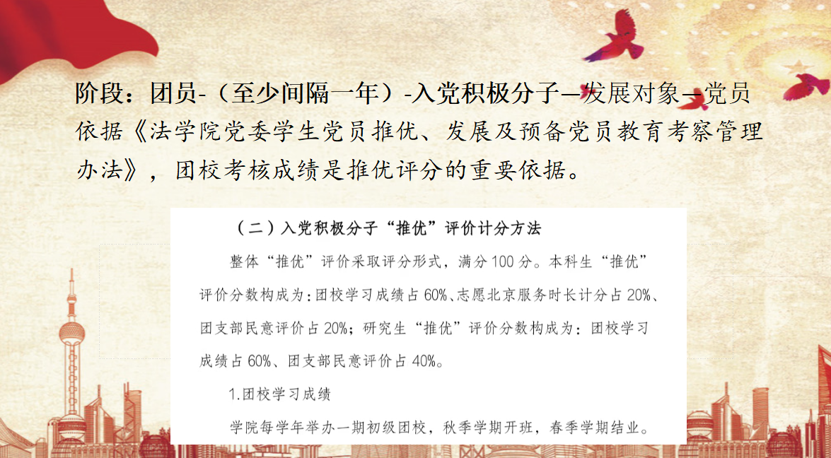 随后,主持人根据《法学院党委学生党员推优、发展及预备党员教育考察管理办法》为大家解读了推优评分构成、法学院初级团校模块设置以及团校考核方法,并在考核方法部分介绍了团校的考勤与请假方式,强调团校培养对于成员参与程度的要求,鼓励同学们多多参与、认真学习,在初级团校中收获时政知识、理论素养与友爱情谊。
