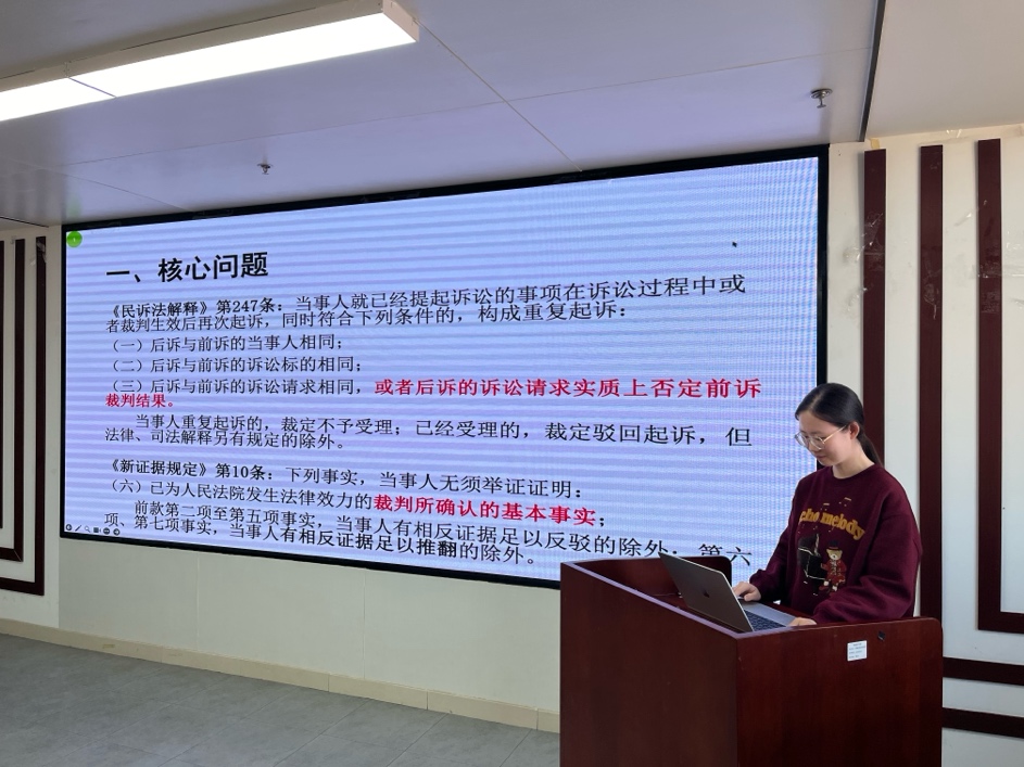 汇报环节,徐小淇从问题缘起、实务考察、既判力扩张至判决理由的边界以及预决效力的适用等方面展开汇报。徐小淇认为,我国《民诉法解释》第247条实质上将我国既判力客观范围扩张至判决理由,同时《证据规定》第10条规定了生效裁判所确认的基本事实产生预决效力。当前后诉当事人相同时,法院对于基本事实的认定产生何种判决效力,两则规范存在一定重叠。基于对《民诉法解释》第247条的分析,实质否定型重复诉讼应仅限于后诉请求本身直接否定前诉判决理由的情况。因此对于前诉判决理由中所认定的基本事实,只有能够独立作为诉讼标的予以争议的内容才可能成为实质否定型重复诉讼规制的对象,也即既判力客观范围扩张至能够独立作为诉讼标的的基本事实。预决效力的适用应注意排除反证事由,其适用范围不得泛化。在相同当事人之间,在既判力客观范围之外的基本事实认定结果产生不可推翻的预决效力。