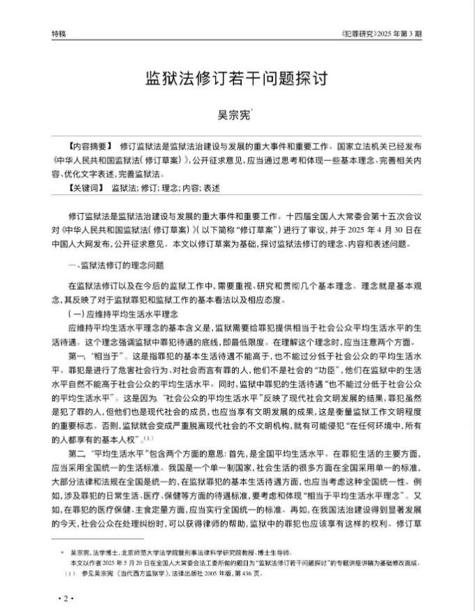 吴宗宪教授是我国当代最重要的监狱学研究者之一。他曾任司法部预防犯罪研究所监狱学研究室主任和研究员,2006年调入北京师范大学之后,继续从事这方面的研究和教学工作,对监狱、监狱学、监狱法等做了全面、深入、系统的研究,先后出版了《当代西方监狱学》(法律出版社2005年)、《监狱学导论》(法律出版社2012年)、《罪犯改造论——罪犯改造的犯因性差异理论》(第二版,商务印书馆2019年)等专著,主编了《我国监狱法修订研究》(中国社会出版社2021年)等书籍,发表了多篇监狱法修订论文,进行了多方面的理论研究。同时,吴宗宪教授多年来考察了国内的上百所监狱以及国外的几十所监狱和矫正机构,对于监狱实务工作也有充分了解。