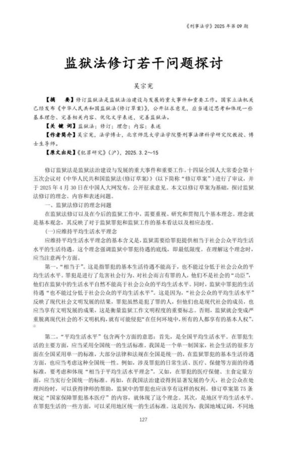 鉴于他在监狱领域的研究工作,2025年5月20日上午应邀到全国人大法工委举办了题目为《监狱法修订若干问题探讨》的专题讲座,以讲座内容为基础撰写的论文《监狱法修订若干问题探讨》,先在《犯罪研究》2025年第3期发表,后被中国人民大学报刊复印资料《刑事法学》2025年第9期全文转载。讲座中提出的多项建议,被监狱法修订草案吸收。