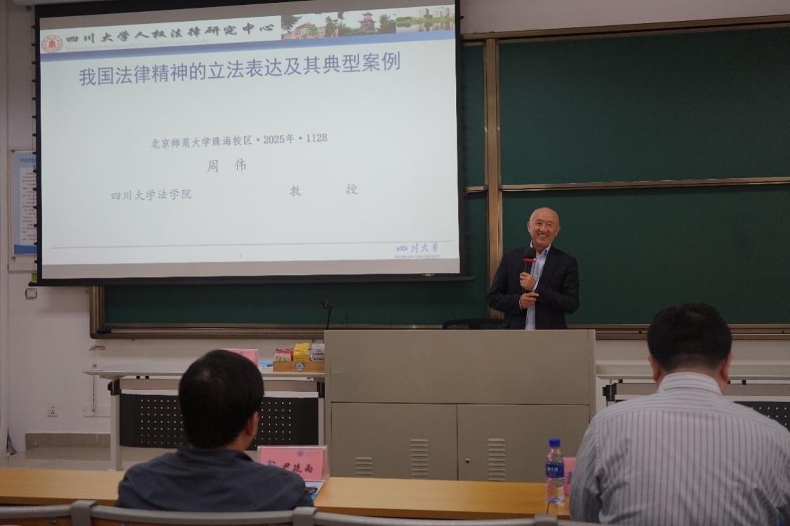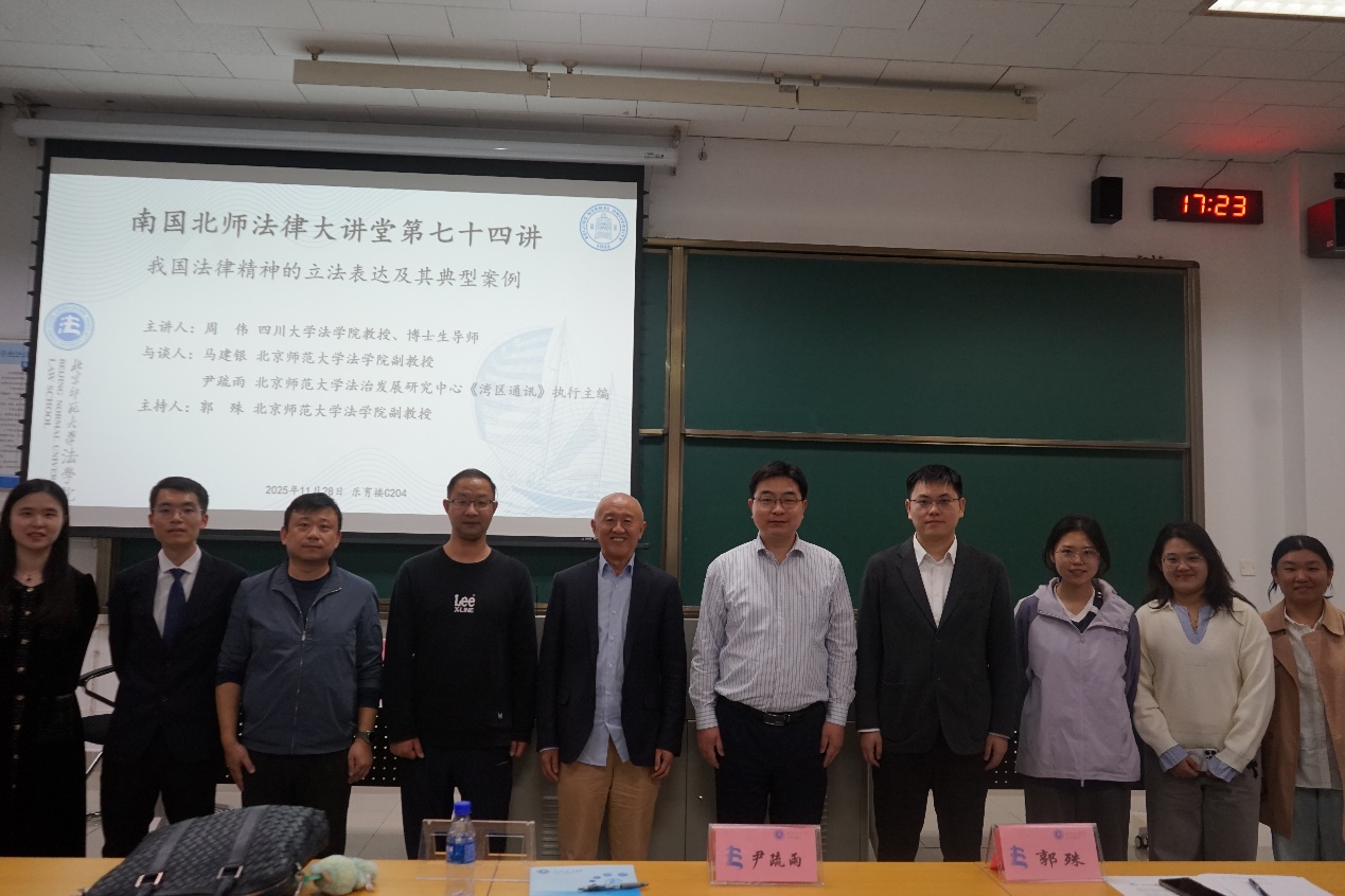 11月28日,南国北师法律大讲堂第七十四讲“我国法律精神的立法表达及其典型案例”在北京师范大学珠海校区乐育楼C204教室圆满举行。本次讲座由四川大学法学院教授、博士生导师周伟老师主讲,北京师范大学法学院副教授马建银老师、北京师范大学法治发展研究中心《湾区通讯》执行主编尹疏雨老师与谈,北京师范大学法学院副教授郭殊老师主持。