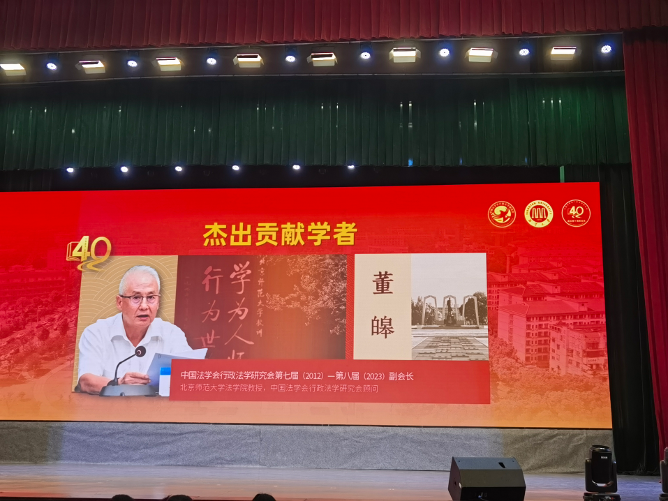 2025年10月18日上午,中国法学会行政法学研究会2025年年会在湖南湘潭隆重召开。本次年会由中国法学会行政法学研究会主办、湘潭大学承办。全国人大常委会、最高人民法院、最高人民检察院、司法部等部门的领导,来自北京大学、清华大学、中国人民大学、中共中央党校(国家行政学院)等高校和科研机构的专家学者等500余人齐聚一堂,共襄盛举,回顾四十年辉煌历程,共绘新时代行政法治发展蓝图。大会宣读并表彰了中国行政法学“终身成就学者”、中国行政法学“杰出贡献学者”,颁发了“从事行政法教研四十年”荣誉证书,宣布了“中国行政法学四十年优秀成果”“2025年年会优秀论文”,颁发了第十二届“应松年行政法学奖学金”。其中,北京师范大学法学院董皞教授荣膺中国行政法学“杰出贡献学者”称号。